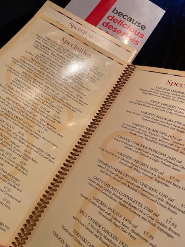 Cheescake Factory has every option under the sun in a spiral bound laminated book they call a menu. They have options for drinks, salads, small dishes, sides, main dishes and desserts and all of them have multiple parts – not to mention there are additional inserts for specials and one that highlights the desserts!