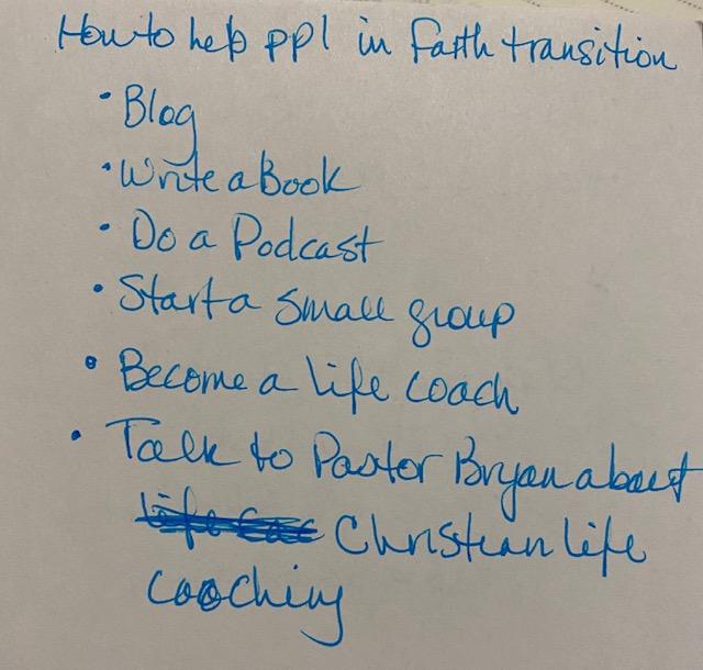 So, now I have my vision. I want to help people in faith transition – more specifically I want to assist people who are looking to sort out something they are struggling with when it comes to their spiritual life. So, I make a list of the ways I can do that. In no particular order.