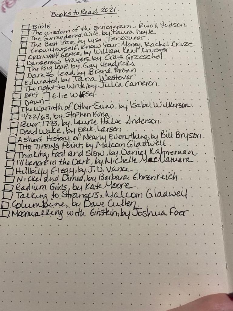 Anyway — and this is where it get’s really handy — towards the back of the journal you create “collections”. Places for you to keep the random thoughts you have or have most often. Like books. I’m constantly getting book selections from people, from articles I read, from Entertainment Weekly (which is actually a monthly publication now, but whatever)…and I write them down and then can never find them. Now I have a “collection” for 2021 —