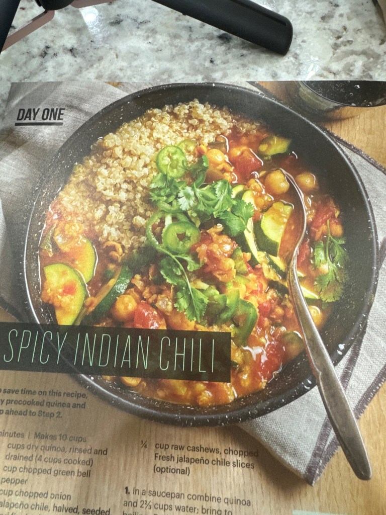 Tonight I decided to have a little adventure in the kitchen. In one of my Forks Over Knives magazines there is a 5-day meal plan. One of the recipes was for “Spicy Indian Chili”. Let’s be honest. I’m a wimp when it comes to spicy foods. I’m a “zero” in the spice scale at Thai restaurants. Maybe a “1” if I’m feeling saucy. But, I decided to try.