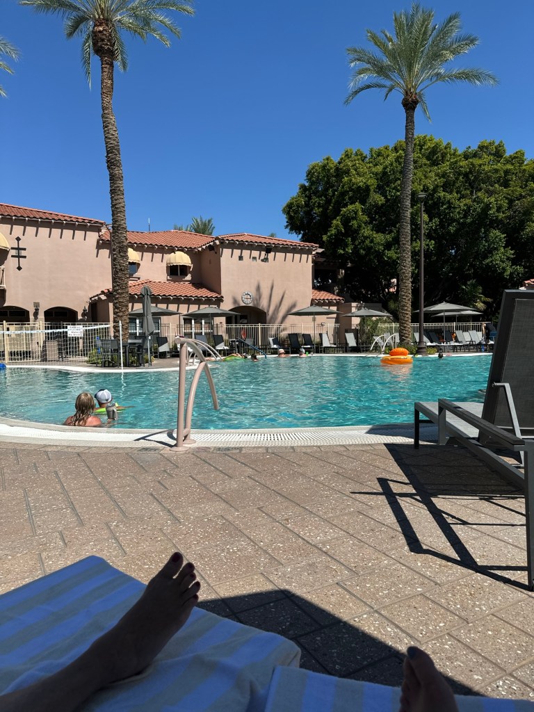 Wednesday was a pool day. The best thing about coming to Phx in the dead of summer is that no one else does. The pool is fairly empty and the kids that are here vacationing with their families are few and pretty well-behaved. They also pipe in cool water to the pool so it’s so refreshing after sitting in the chairs for a few. Sun is intense here for sure, and sun screen is a must.