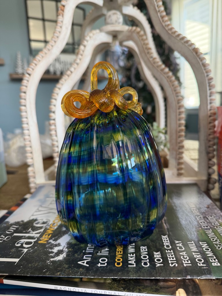 A couple of weeks ago, Frank arranged the perfect day-date. He made arrangements for me to work one-on-one with Jake, the owner of Hot Glass Alley in north Charlotte. Jake is about 35, and caught the glass-blowing bug when he saw the process at an open-air market in Bermuda when he was 13. He was apprenticing for free when he was 15 in his hometown of Rochester, NY. Later, he would attend RIT and earn his MFA in glass art. About seven years ago, he relocated down here to escape the cold and the snow, and he opened his own studio. And it is fantastic. Being fall, one of the projects on the list to choose from was making a pumpkin. I was able to pick two colors for the pumpkin and one for the stem. I chose royal blue, lime green, and gold.